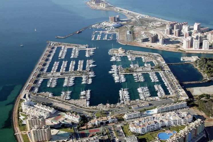 Puerto Deportivo Tomás Maestre marina , located in the town of La Manga del Mar Menor, in the region of Murcia, Spain. The marina is situated on the Mar Menor, a saltwater lagoon separated from the Mediterranean Sea by a narrow strip of land.